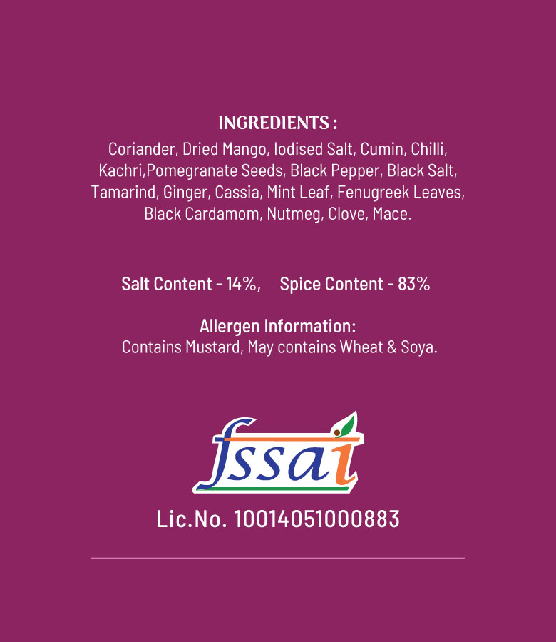 Ingredients (New Design): Coriander, Dried Mango, iodised Salt, Cumin, Chilli, Kachri, Pomegranate seeds, Black Pepper, Black Salt, Tamarind, GImger, Cassia, Mint Leaf, Fenugreek Leaf, Black Cardamon,Clove, Nutmeg, Mace.