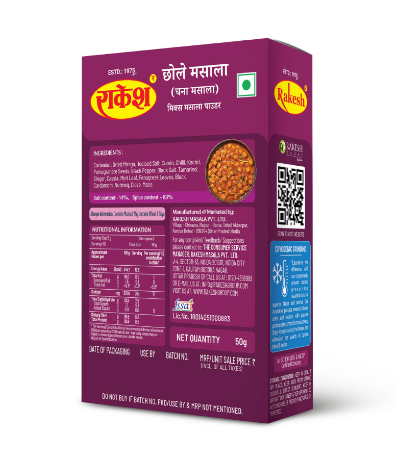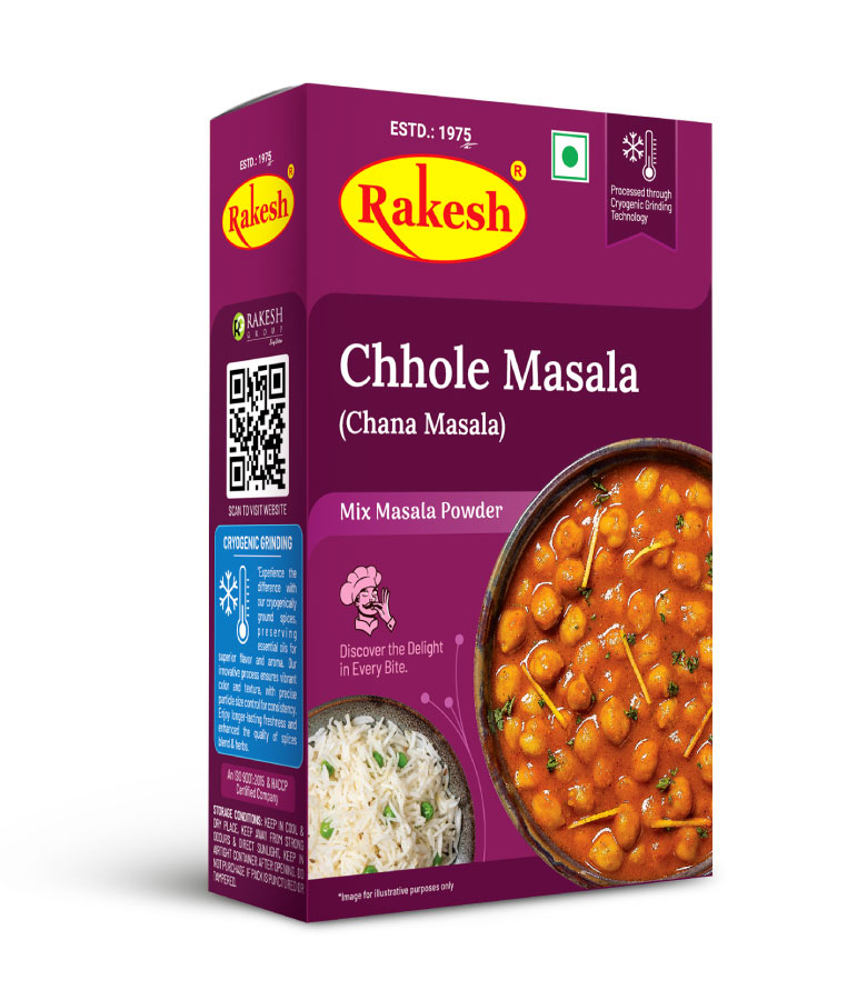 Cooking Instruction: Soak 500g Chick Peas/Chhole.In a large pan heat 100ml cooking oil. Fry two chopped onions till golden brown. Add two chopped tomatoes and stir Add 50g Rakesh Chhole/Chana Masala & Salt to the taste. Add Water and 1g baking soda. Simmmer for 35-40 minutes on low heat and put some Rakesh Kasoori Methi before taking off from the low heat.