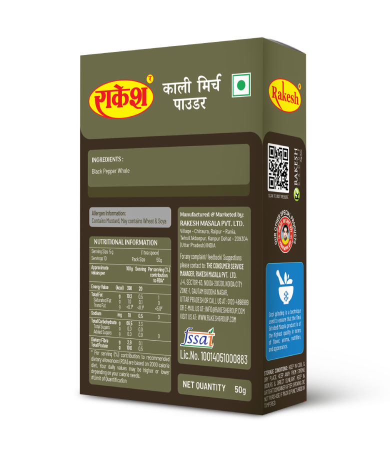 Rakesh Black Pepper Powder is highly recommended for use in veg. & non veg dishes like Salties, Samosas, Pakoras, Fried Cashew nuts, Almonds, Fruit Chat, Potato Chat, Dahi Vadas, Meat, Chicken & Salad etc.
