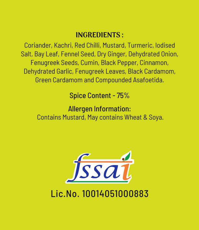 Coriander, Kachri, Red Chilli, Mustard, Turmeric, Edible Salt, Bay Leaf, Fennel Seed, Dry Ginger, Dehydrated Onion, Fenugreek Seeds, Cumin, Black Pepper, Cinnamon, Dehydrated Garlic, Fenugreek Leaf, Black Cardamom, Green Cardamom & Compounded Asafoetida.